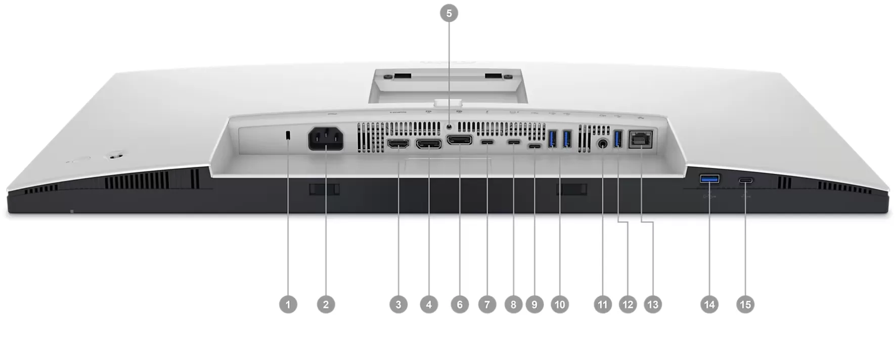 Cổng cắm khác: 1x ThunderboltTM 4 downstream port (15W) for daisy chaining, 1x Security lock slot (based on Kensington Security Slot™), 1x Power connector, 1x Audio line out, 1x Stand lock, 1x RJ45 port (2.5G)