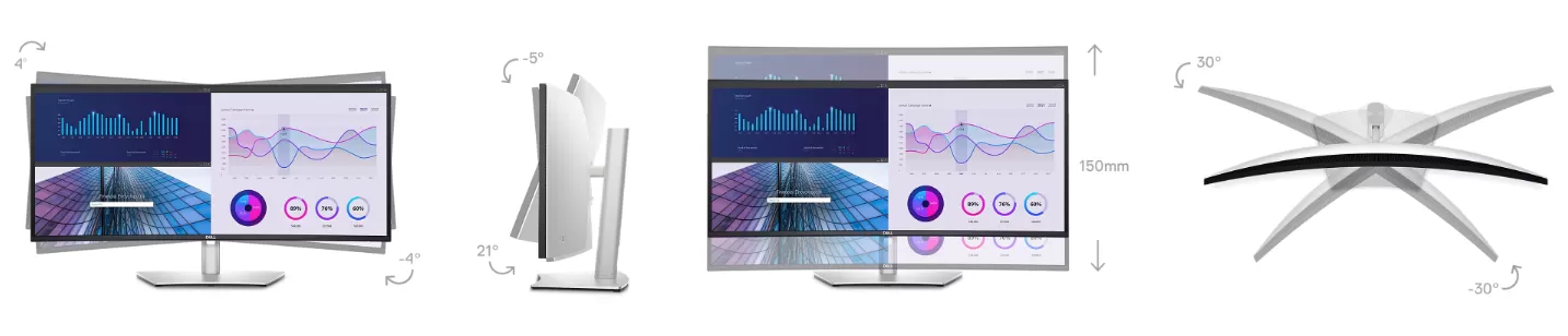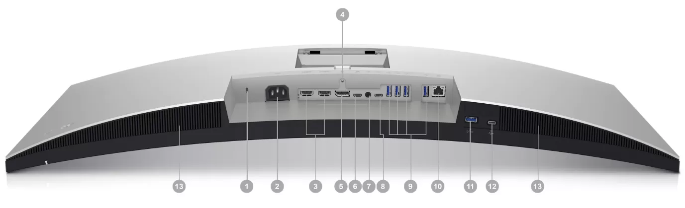 Cổng kết nối: 1 x DisplayPort 1.4, 2 x HDMI 2.1, 1 x USB Type-C upstream port (video and data,PD up to 90 W), 1 x USB-C upstream port ( data ), 4 x USB 3.2 Gen2 Type-A downstream, 1 x USB 3.2 Gen2 Type-C downstream port with charging capability at 15 W , 1 x super speed USB 10 Gbps (USB 3.2 Gen2) Type-A, 1 x Audio line-out port, 1 x RJ45 port