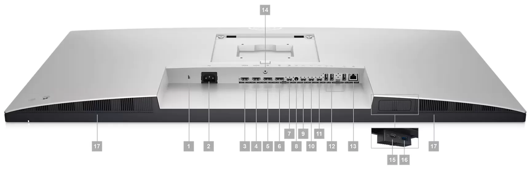 Kết nối: 2x DisplayPort 1.4, 2x HDMI 2.1, USB-C 3.2 Gen 1 upstream (xuất hình , power up to 90W), 3 x USB-C Upstream port, Data Only, 4 x USB 3.2 Gen 1 type A downstream , LAN (RJ-45) , 1 x USB C Upto 15W charging) downstream